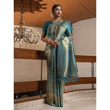 Show moreElevate your ethnic wardrobe with our exquisite Sarees for Women Banarasi Kanjivaram Silk Indian Sari. Crafted from premium Banarasi raw silk, this saree radiates elegance and sophistication, making it a perfect choice for festive occasions or special events. The beautiful teal blue color, complemented by a stunning woven design, promises to make you the center of attention. With a length of 5.5 meters, this saree drapes gracefully, showcasing the intricate craftsmanship that is synonymous with traditional Indian wear. The accompanying unstitched blouse fabric in luxurious brocade adds an extra touch of elegance, allowing you to customize the fit to your preference.