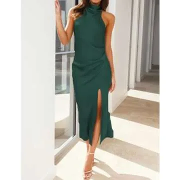 Satin Halter Backless Silt Midi Dress for Women 2024 Elegant Formal High Neck Cowl Back Silk Wedding Guest Sexy Dresses Dark Green