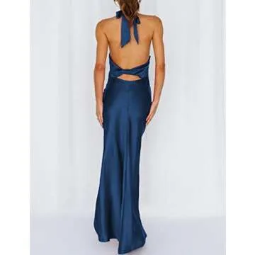 Satin Silk Halter Tie Neck Maxi Formal Dresses for Women- Open Back Twist Ruched Slit Midi Cocktail Dress for Wedding Guest Navy