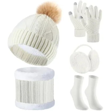 Show moreEmbrace the chill of winter with the SATINIOR 5 Pcs Winter Hat Scarf Gloves Set, the ultimate ensemble designed to bring warmth and style to your outdoor wear! This exquisite set is perfect for ladies seeking both function and fashion, featuring a chic rhombus-patterned knit beanie, a soft fleece-lined scarf, touch-screen gloves for added convenience, cozy earmuffs, and warm stockings. Together, these essentials ensure that each of your winter excursions, whether it's a snowy ski trip or a leisurely park stroll, is met with comfort and flair.