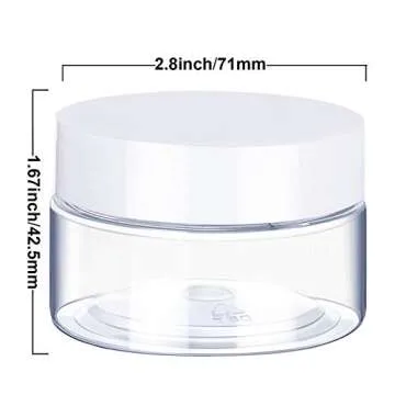 Show more Introducing our exceptional set of 6 refillable, clear plastic container jars, designed for both beauty and functionality. Made from high-quality PET plastic, these jars are not only durable and break-resistant but also versatile for various uses. Each jar is equipped with a screw-on lid that features a foam liner, ensuring an airtight seal to protect your contents from leakage or drying out. Perfect for storing cosmetics, paints, jewelry, or even party favors, these jars combine both practicality and aesthetic appeal.