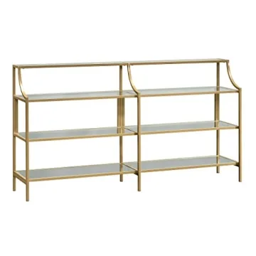 Show more Introducing the Sauder International Lux Console Table, a stunning 5-tier multipurpose piece that seamlessly combines function and elegance. Crafted with a durable metal construction and finished in an exquisite satin gold, this console table is perfect for both contemporary and classic home aesthetics. The expertly designed open shelving allows you to display your books, framed photos, collectibles, or plants, adding a stylish touch to any room. With its safety-tempered glass shelves, not only do you get a sophisticated look, but the transparency of the glass lets your treasured items shine through, creating an illusion of more space in the room.