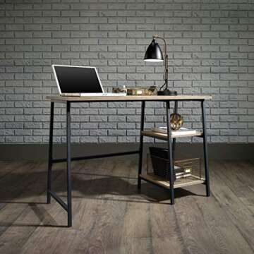 The desk features a charming Charter Oak finish coupled with a durable black metal frame.