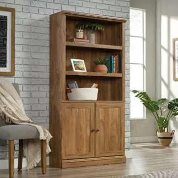 Show moreIntroducing the Sauder Select Book Shelf – a beautifully crafted bookshelf that effortlessly combines functionality and elegance. With its stunning Sindoori Mango finish, it’s designed to complement any decor, bringing a touch of warmth and sophistication to your living space. This bookshelf is not only a masterclass in design but also a practical solution for your storage needs. Featuring three adjustable shelves, you have the versatility to store a variety of items, from cherished books to decorative pieces. The hidden storage behind the doors provides a perfect way to keep clutter out of sight, ensuring that your space remains tidy and organized.