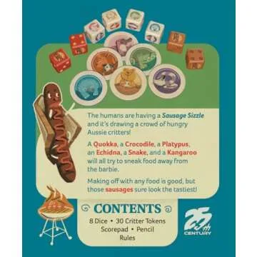 Show moreIntroducing the Sausage Sizzle: Press Your Luck Dice Rolling Game by 25th Century Games, where agility and strategy meet the delightful world of Australian wildlife! Gather your friends and family for an exciting game experience that promises laughter, thrill, and unforgettable moments. In this fast-paced game, players will guide hungry Aussie critters—like the Quokka, Crocodile, Platypus, Echidna, Snake, and Kangaroo—as they attempt to sneak juicy sausages from a sizzling barbecue. Each player takes on the role of these fun-loving critters, rolling and re-rolling dice to score critters and high-value food dice while dodging whatever unexpected twists the game throws your way! With simple rules and engaging gameplay, Sausage Sizzle is perfect for all ages and gaming levels.