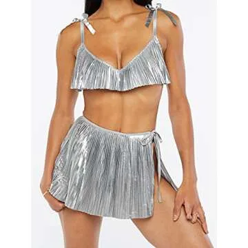 Savage X Fenty Women's Pleated Lamé Skirt with Tie Closure, Metallic Silver, M