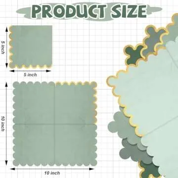 Show more Introducing the Saypacck 100 Pack Scalloped Cocktail Napkins – the perfect blend of elegance and functionality for any event. Crafted with meticulous attention to detail, these napkins are presented in a delightful range of gradient green colors, featuring a sophisticated scalloped edge adorned with gold foil accents. Each pack contains 100 napkins, segmented into 25 pieces of four vibrant green shades: pale green, light green, hot green, and blush green, allowing you to mix and match according to your party's theme. Whether hosting a wedding, baby shower, birthday party, or an intimate dinner, these napkins are designed to impress your guests and elevate the ambiance of your occasion.