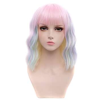 Show moreUnleash your inner unicorn with the stunning Schila Wig Rainbow Colorful Short Bob Wavy Wig With Bangs! Crafted from high-quality, heat-resistant synthetic fiber, this delightful 12-inch wig offers a mesmerizing blend of pastel pink and rainbow hues that will make you the center of attention at any party or event. Whether you're dressing up for Halloween, a cosplay event, or simply wanting to infuse some fun into your everyday look, this wig is designed to provide a soft, natural appearance without compromising comfort.