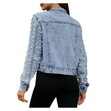 SCOFEEL Pearls Cropped Jean Jacket for Women Regular Fit Embroidered Denim Jacket Coat Light Blue, Small