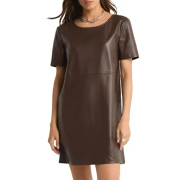 SCOFEEL Women's Faux Leather Mini Dress Short Sleeve Leather Tunic Dress A-Line Leather Shift Dress Coffee
