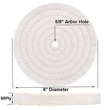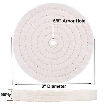 Show more Experience the highest quality in buffing and polishing with the SCOTTCHEN Extra Thick High Grade Cloth 8 Inch Buffing Polishing Wheel. Designed specifically for use with bench grinders, these wheels are crafted from white cotton material consisting of a substantial 90 ply, ensuring durability and an exceptional finish. The 5/8" arbor hole fits a variety of bench grinder installations perfectly, allowing for easy attachment and usage. Whether you're polishing jewelry, metal, or plastic, these buffing wheels deliver professional results every time, making them an essential tool for hobbyists and professionals alike.