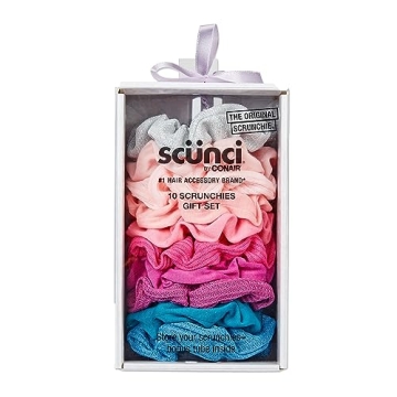 Show moreTransform your hair accessory game this holiday season with the stunning Scunci by Conair Gift Set. Perfect for those who love to express their style, this delightful collection features a vibrant assortment of 10 scrunchies in beautiful pink and purple shades, designed to add a lively pop to any hairstyle. Known for their quality and style, Scunci ensures that these scrunchies are not only eye-catching but also super-stretchy and comfortable for all-day wear. Slip into your favorite look whether you're running errands, at the gym, or attending a festive party.