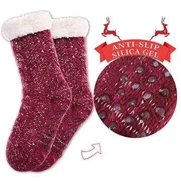 SDBING Women's Fuzzy Slipper Socks Soft Fluffy with Grippers Socks Winter Warm Non Slip Fleece Lined Socks (Wine Red)