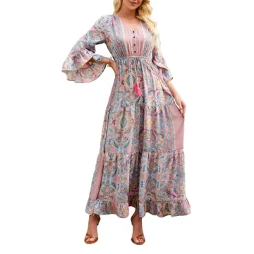 SDEER Women's Floral Print Bohemian Dress V Neck Flare Sleeve High Waist Swing Long Dress Beach Vacation Dresses(Green,L)