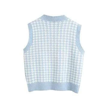 Sdencin Women Houndstooth Pattern Knit Sweater Vest Sleeveless Loose V-Neck 90s Waistcoat Pullover Knitwear Top Blue