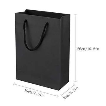 Show more Introducing the **Sdootjewelry Black Gift Bags**, a perfect blend of style and sustainability! Each bag in this 50-pack set measures 7.5" x 3.1" x 10.2", crafted from thick, eco-friendly kraft paper that is both recyclable and biodegradable. Designed for versatility, these glamorous matte black bags are ideal for every occasion, whether you're wrapping up gifts for a birthday party, a wedding, or even your business merchandise. With their elegant look and sturdy build, these bags not only make a great first impression but also support environmentally conscious choices.