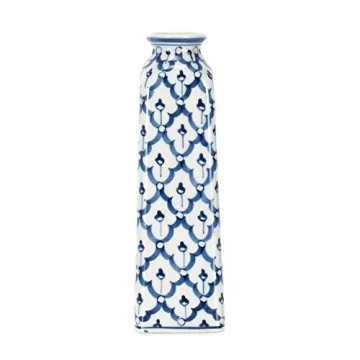 The vase boasts a glossy blue and white finish, enhanced by a classic hand-painted geometric pattern.