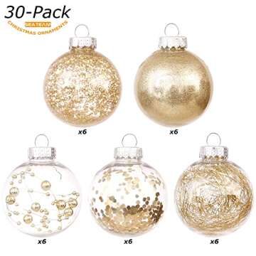 Transform your holiday decorating with the Sea Team Shatterproof Clear Plastic Christmas Ball Ornaments. This stunning 30-pack set features exquisitely decorated 60mm (2.36") baubles that perfectly blend elegance and durability. Each ornament showcases a clear glaze base adorned with a myriad of sparkling details, including glitter, sequins, and beads that shimmer beautifully when illuminated. These attributes not only enhance the aesthetics of your tree but also ensure they become cherished...