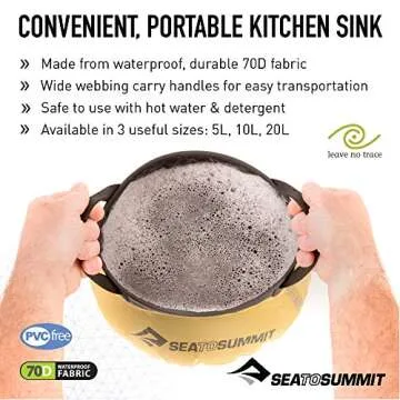 Show moreDiscover the ultimate companion for your outdoor adventures with the Sea to Summit Collapsible Kitchen Sink. This high-quality, 10-liter basin is designed for a multitude of tasks ranging from hauling water to efficient meal prep, dishwashing, and even personal hygiene. Crafted from durable 70D waterproof nylon, it boasts fully taped seams, ensuring that it withstands the rigors of outdoor use. It readily accommodates mild soaps and can handle hot water up to 140 degrees Fahrenheit, making it versatile for all your culinary needs in a camping or backpacking environment.