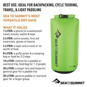 Show moreThe Sea to Summit Lightweight Dry Sack is your ultimate companion for outdoor adventures, offering remarkable versatility and functionality. With a capacity of 13 liters, it's perfect for storing clothes during your paddle trips or as a food bag for up to two people. Its dimensions of 8.6 x 21 inches make it compact enough to fit into any backpack without adding significant weight. At just 3.3 ounces, this dry sack is incredibly lightweight yet built with tough 70D Nylon featuring a Polyurethane waterproof coating, ensuring your gear remains dry in even the wettest conditions.