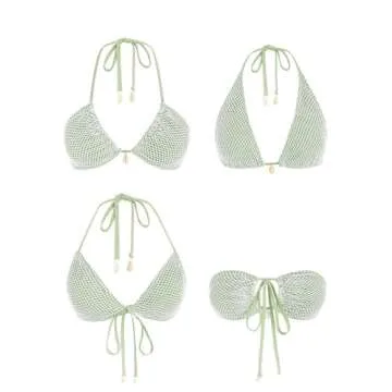 seamoly Womens String Bikini Sets Fishnet Shell Triangle High Cut Side Tie Thong Halter Bathing Suit 2 Piece Swimsuits Green S