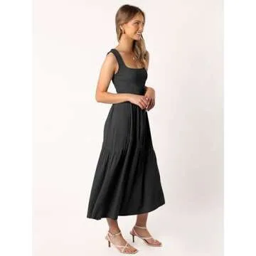 SEBAQINY Wedding Guest Dress Maxi: Women’s Square Neck Strap Spaghetti - Casual Summer Beach Long Sundress SE2466 (Black,Medium)