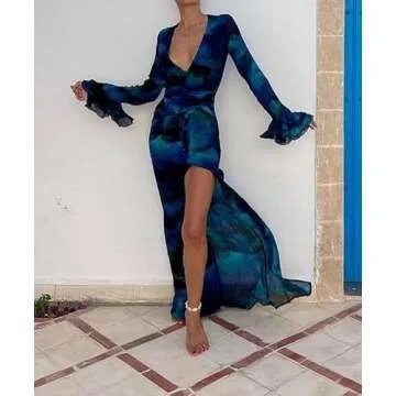 This stunning maxi dress stands out with its playful ruffle back and backless design, creating a daring yet feminine silhouette. The ruffle-edged exaggerated sleeves are complemented by extra long cuffs, bringing a touch of drama to your ensemble. Perfectly versatile, the adorable floral patterns and vibrant tie-dye prints inject a fun flair that can easily transition from a beach outing to a glam night party. Whether layered over a bikini for a day in the sun or paired with heels and accessories for an evening affair, this dress guarantees all eyes are on you.