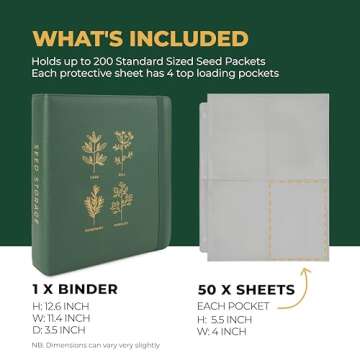 Show more Introducing the ultimate companion for every gardening enthusiast: the Large Seed Binder Organizer. Designed to hold up to 200 seed packets in one beautifully crafted location, this organizer is not just about functionality but also about enhancing your gardening experience. With 50 pack of 4 pocket sheet protectors measuring 4”x5.5”, you can easily store, file, and sort your seeds for quick access and inventory management.