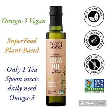 Show more Experience the powerful benefits of nature with our Seeds of Wellness Chia Seed Oil. Each daily shot (1 Teaspoon / 5 ml) delivers a high concentration of OMEGA-3 and essential BIO-NUTRIENTS that your body craves. This premium quality oil is packed with the highest amount of OMEGA-3 VEGAN ALA per teaspoon, making it an excellent source of healthy fatty acids perfect for those on keto diets, as well as being gluten-free and non-GMO.