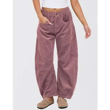 SeekMe Women's Corduroy Pants Barrel Mid-Rise Elastic Waist Cord Pants Casual Wide Leg Baggy Trouser with Pockets(0005-PastelViolet-XS)