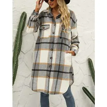 SeekMe Women's Plaid Long Shirt Jacket Button Down Long Sleeve Lapel Collar Pocket Shacket(0449-Grey-M-FY)