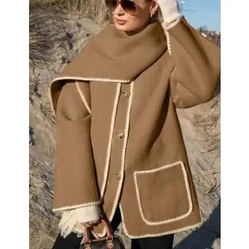 SeekMe Womens Embroidered Scarf Jacket Oversized Wool Blend Coat Button Down Winter Outerwear with Tassel Scarf(1818-Camel-M-FY)