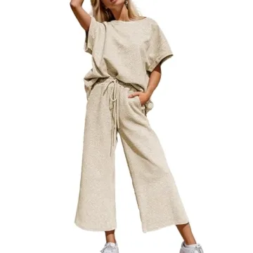 Show more Revamp your wardrobe with the stunning SeeLuNa Women's 2 Piece Outfits Textured Sweatsuit, a must-have item that seamlessly blends style with comfort! This sophisticated two-piece set features a beautifully crafted pullover top designed with 3/4 batwing sleeves and a classic crew neck that flatters the shoulders and enhances your silhouette. The accompanying high-waisted drawstring pants effortlessly transition from casual outings to elegant gatherings, making it the perfect versatile ensemble for every occasion. With its rich color options and luxe fabric, this outfit will undoubtedly become your go-to choice for a chic look.