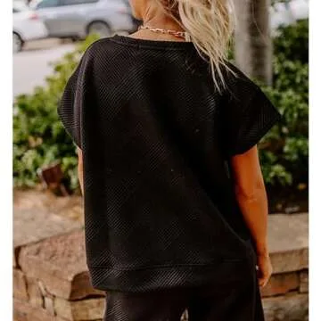 SeeLuNa Women's 2 Piece Outfits Textured Sweatsuit 3/4 Batwing Sleeve Crew Neck Pullover Top Wide Leg Pant Tracksuit Set(Black,S)