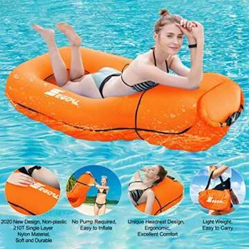Show more Relax and unwind in style with the SEGOAL Pool Floats Inflatable Floating Lounger Chair. This innovative inflatable float is designed for those who value both comfort and convenience while enjoying their time around the pool or at the beach. Made from lightweight single-layer nylon fabric, this float is incredibly easy to handle and perfect for leisurely floating. One of its standout features is its quick-fill design which allows it to be inflated in just three seconds without the need for a pump—allowing you to hit the water faster than ever. Whether you're lounging with a good book or drifting lazily under the sun, this floating lounger chair effortlessly combines practicality with relaxation.