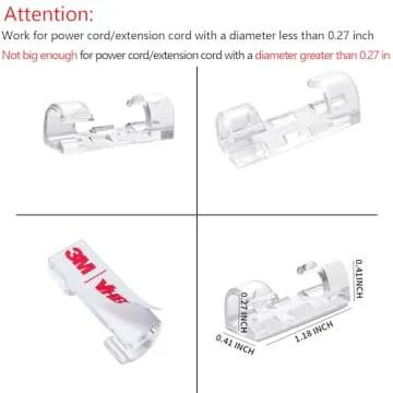 Show more Introducing the ultimate solution for keeping your cables organized and tangle-free! Our cable clips are designed to fit cables with a diameter of 0.15 to 0.27 inches, ensuring a snug and secure hold for your essential cords. With superior stickiness provided by a strong acrylic adhesive, these clips will adhere to any clean, smooth surface, giving you peace of mind that your cables will stay in place.