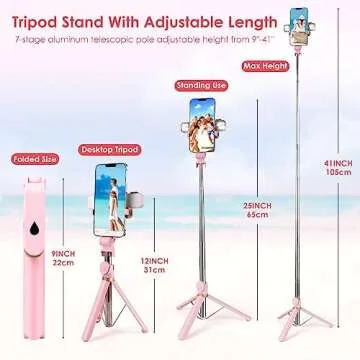 Selfie Stick with Fill Light,Extendable Selfie Stick Rugged Tripod with Wireless Remote Compatible with iPhone 14 13 12 11 pro Xs Max Xr X 8 7 6 Plus, Android Samsung Smartphone (Pink)