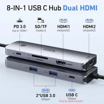Show moreTransform Your Workspace with the Selore USB C Docking Station! The Selore 8-in-1 USB C Docking Station Dual HDMI Monitor is designed to elevate your productivity with its sleek and efficient functionality. This powerful docking station enables you to connect dual monitors with stunning 4K@60Hz resolution through its two HDMI ports, allowing for seamless screen extension or mirroring. Perfect for professionals and creatives alike, it is compatible with a wide range of laptops, including Dell XPS, HP, Lenovo, Surface, and Yoga. With its extensive connectivity options—including 2 USB-A ports, a USB-C port, a 100W power delivery charging feature, and SD/MicroSD slots—this device serves as your complete high-performance hub.