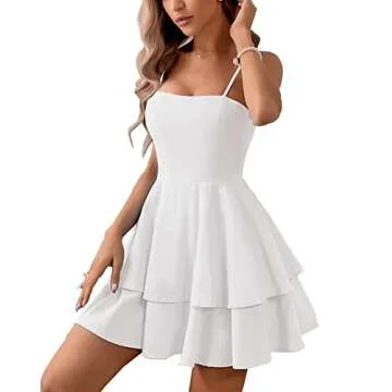 Show more Introducing a stunning addition to any young lady's wardrobe, this gorgeous adjustable spaghetti strap cami dress is designed to impress. The double layered ruffle hem brings a playful touch while maintaining a sophisticated edge. With a chic back knot tie and a unique hollow-out design, this dress blends elegance and fun perfectly. Crafted with a slim fitted style and a flattering square neck, it gracefully falls just above the knee, making it suitable for various occasions. Offered in solid colors, this dress features an elastic waist that enhances comfort while ensuring an ideal fit.