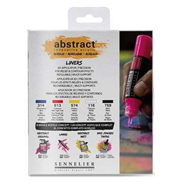 Show moreUnlock your artistic potential with the Sennelier 27ml Abstract Liner Set, a must-have for artists who value precision and flexibility in their creative endeavors. This set features five richly pigmented colors housed in an easily refillable 27ml bottle, providing you with the freedom to create stunning artwork without worrying about running out of supplies. The flexible squeeze bottle design allows for precise control, whether you’re detailing intricate patterns or making bold statements. Crafted by Sennelier, a brand synonymous with quality and artisanal craftsmanship, this set is designed to elevate your art to the next level.