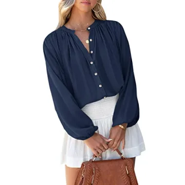 SENSERISE Womens Long Sleeve Button Down Shirt Casual Solid Color Balloon Sleeve V Neck Tops Satin Silk Blouses(Navy Blue,L)