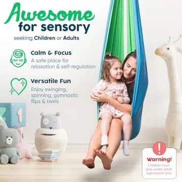 Show more Embrace the joy and serenity that our trusted sensory swing brings to every home, therapy center, or school environment. Designed to support sensory engagement, this innovative swing is a game-changer, rooted in research from the Journal of Autism and Developmental Disorders. It provides a safe and calming atmosphere where users can relax, recuperate, and focus on their emotional well-being. With its high-quality construction, our swings ensure *greater balance, coordination,* and *motor skills* development while reducing anxiety, creating the perfect cocoon of comfort and support.