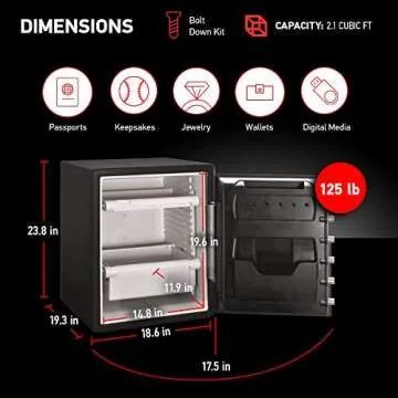 This spacious fireproof safe boasts generous exterior dimensions of 18.6 inches W x 19.3 inches D x 23.8 inches H and an impressive interior capacity of 2.05 cubic feet. Designed for convenience, it features a strong, preset combination lock eliminating the hassles of battery replacements while offering reliable security with every use. The safe’s robust construction includes six live-locking bolts and a pry-resistant hinge bar that enhance its durability and security. Customers appreciate the manual dial operation, which bypasses electronic malfunctions, giving you a steadfast locking mechanism you can rely on.
