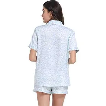 Serenedelicacy Women's Satin Pajama Set 2-Piece Sleepwear Loungewear Button Down Short Sleeve Silky PJ Set (X-Small, Light Blue, Leopard)