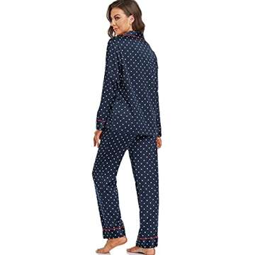 Serenedelicacy Women's Satin Pajama Set 2-Piece Sleepwear Loungewear Long Sleeve Button Down Silky PJ Set (Medium, Navy/Red, Dots)
