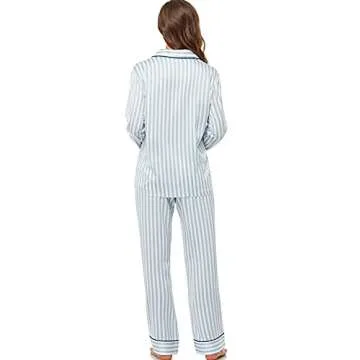 Show moreExperience ultimate relaxation with the Serenedelicacy Women's Satin Pajama Set, crafted from a luxurious silk-like satin fabric that feels incredible against the skin. Designed for versatility, this stunning 2-piece pajama set is perfect for a peaceful night's sleep, lounging gracefully at home, or effortlessly elevating your daily casual wear. The beautiful blue striped design not only showcases an elegant aesthetic but also ensures you feel both fabulous and comfortable, making it a staple in your nightwear collection.