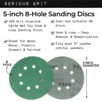Show more Introducing the ultimate solution for all your sanding needs - the Serious Grit 5-Inch, 8-Hole 100 grit hook & loop sanding discs. Crafted with precision and durability in mind, these sanding discs are made from a strong polyester film construction, ensuring they won't tear or fray, even when used around corners. Each disc features a long-lasting 60% nylon hook & loop backing, allowing for repeated use without the worry of discs flying off your sander. All this adds up to a remarkable experience in your sanding projects, making the process faster and more efficient than ever.