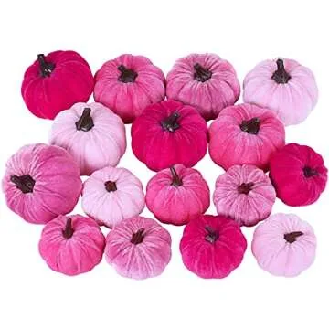 Show more Introducing the exquisite Set of 16 Faux Assorted Velvet Pumpkins, a delightful addition to your fall decor that effortlessly combines style with functionality. This elegant collection features an array of vibrant colors – pink, light pink, hot pink, and magenta. Each pumpkin, crafted from soft velvet fabric and filled with a pumpkin-shaped styrofoam ball, is designed to mimic the lifelike appearance of traditional pumpkins, making them a charming and sophisticated choice for any autumn display. With two varying sizes (3.9" wide & 3.2" tall and 3" wide & 2.6" tall), these plush pumpkins are perfect for decorating tables, wreaths, or any space in your home. Elevate your seasonal aesthetic with this stunning set while adding a pop of color to your decor.