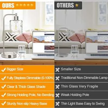 Set of 2 Industrial Table Lamps, Fully Dimmable Desk Lamp with 2 USB Ports for bedrooms, Silver Nightstand Bedside Lamp with Seeded Glass Shade for Reading Living Room Office, 2 LED Bulbs Included