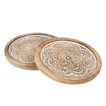 Show more Introducing an exquisite wood trivet that not only serves a functional purpose but also adds an elegant touch to your kitchen decor. This beautiful piece, crafted with the intricate Tree of Life design, is hand-carved by talented local Indian artisans, ensuring that every trivet is unique and a true reflection of fine artistry. Measuring a convenient 8 inches in diameter, it effectively protects your tables and countertops from the heat of hot pots and pans, allowing you to serve your meals with confidence and style.